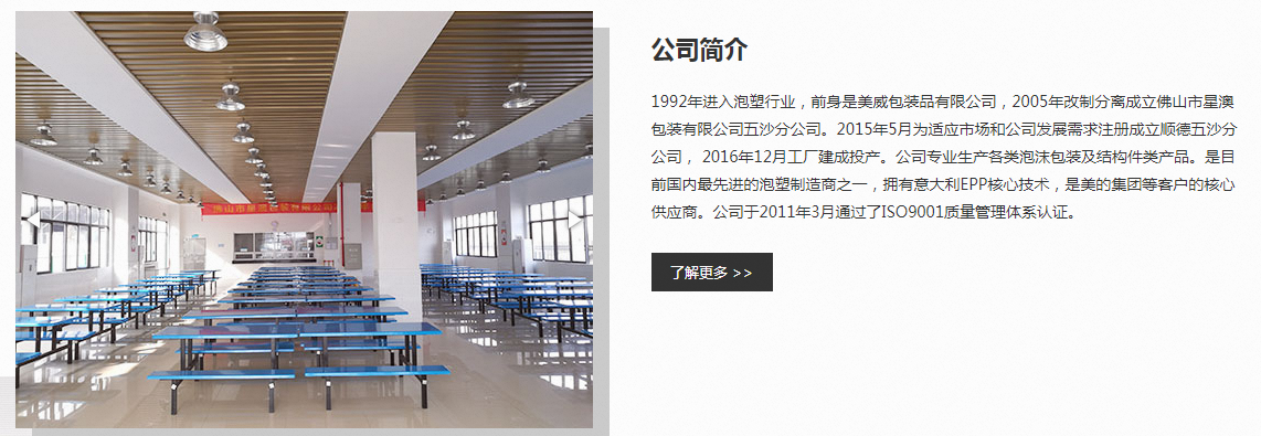 1992年進入泡塑行業,前身是美威包裝品有限公司,2005年改制分離成立佛山市星澳包裝有限公司五沙分公司。2015年5月為適應市場和公司發展需求注冊成立順德五沙分公司, 2016年12月工廠建成投產。公司專業生產各類泡沫包裝及結構件類產品。是目前國內先進的泡塑制造商之一,擁有EPP核心技術,是美的集團等客戶的核心供應商。公司于2011年3月通過了ISO9001質量管理體系認證。