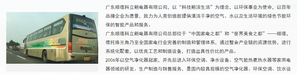 廣東順德科立朗電器有限公司,以“科技朗潔生活”為理念,以事業為使命,以品牌企業為愿景,致力為人類創造能提供清潔干凈的空氣、水以及生活環境的綠色節能智能產品和服務。