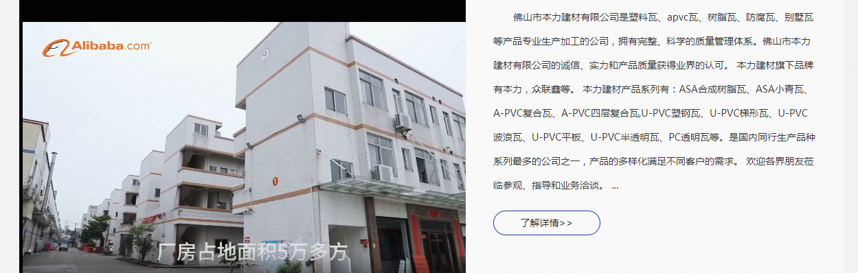 佛山市本力建材有限公司是一家集研發、設計、生產、銷售于一體的專業化屋面建材公司。經過多年的發展,本力建材已擁有員工100多人,占地總面積30000多平方米,擁有9條先進生產線。本力建材旗下品牌有本力,眾聯鑫等。