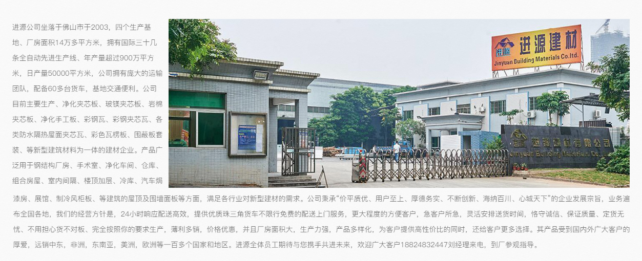 進源公司坐落于佛山市于2003,四個生產基地、廠房面積14萬多平方米,擁有三十幾條全自動先進生產線、年產量超過900萬平方米,日產量50000平方米,公司擁有龐大的運輸團隊,配備60多臺貨車。公司目前主要生產、凈化夾芯板、玻鎂夾芯板、巖棉夾芯板、凈化手工板、彩鋼瓦、彩鋼夾芯瓦、各類隔熱屋面夾芯瓦、彩色瓦楞板、圍蔽板套裝、等新型建筑材料為一體的建材企業。產品廣泛用于鋼結構廠房、手術室、凈化車間、倉庫、組合房屋、室內間隔、樓頂加層、冷庫、汽車焗